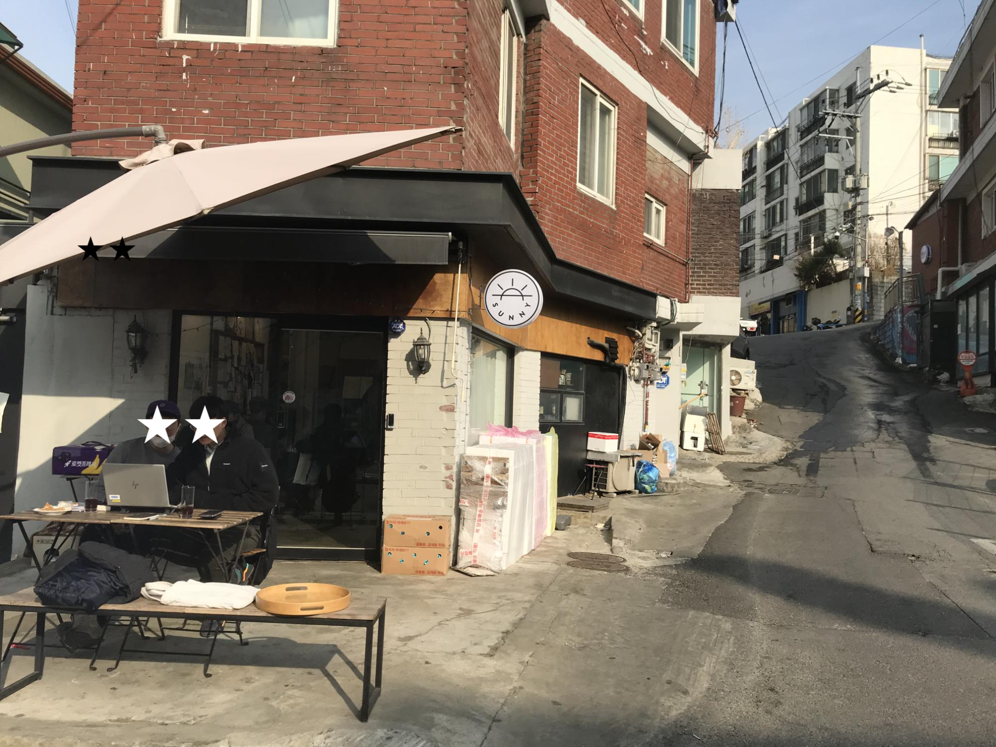 요렇게 계단의 끝에 써니브레드가 있다.^^ 봄바람을 맞으며 야외에서 열작업하고 계시던 두분..