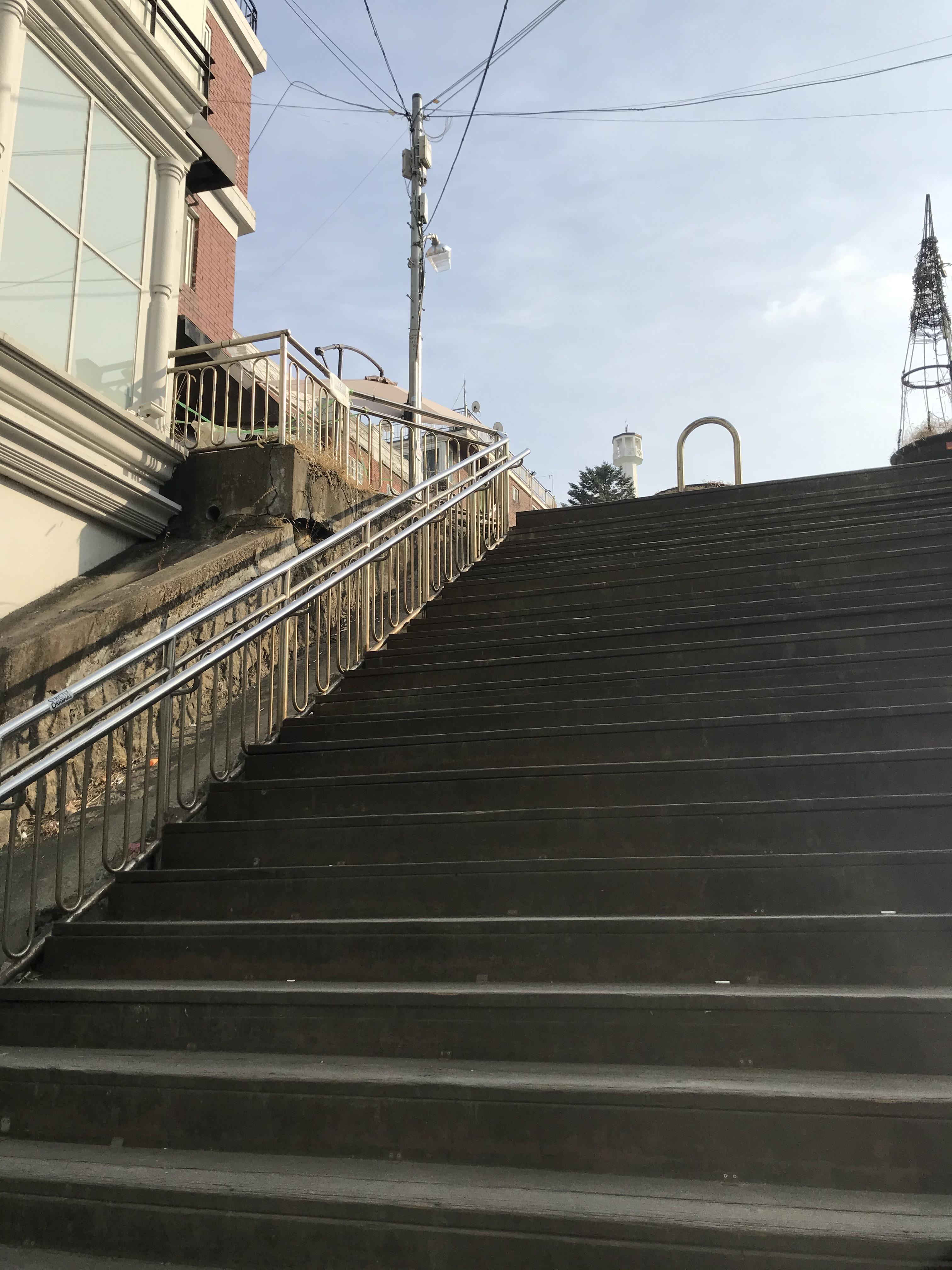 이태원역 3번출구에서 쭈욱 걸어가면 500m 정도 우측에 저렇게 빌리엔젤과 계단이 보인다. (건너편에서 사진 찍음ㅎㅎ)